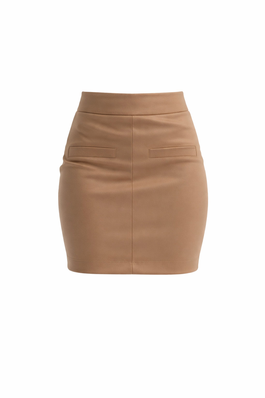 Yüksek bel kesimi ve yalın formuyla öne çıkan bu kahverengi mini etek, modern ve zamansız bir siluet sunar. Pürüzsüz dokusu ve vücuda oturan yapısı sayesinde hem şık hem de dengeli bir duruş sağlar. Minimal cep detayı tasarıma sade bir hareket katarken, klasik çizgisiyle gardırobun kurtarıcı parçalarından biri olmaya adaydır.